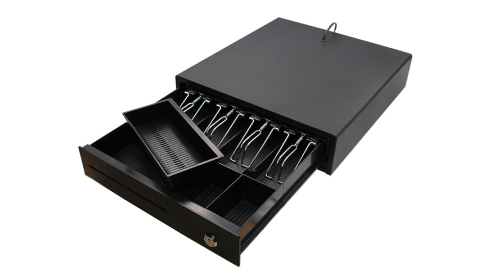 当社の小型キャッシュレジスターには、取り外し可能なコイントレイが付属し、四つの札入れと五つのコインスロットの仕切りを最大化するため、 フロントパネルには大きな紙幣や小切手、領収書を収納できるメディアコンパートメントが1つ付いており、引き出しを開けずに収納できます。